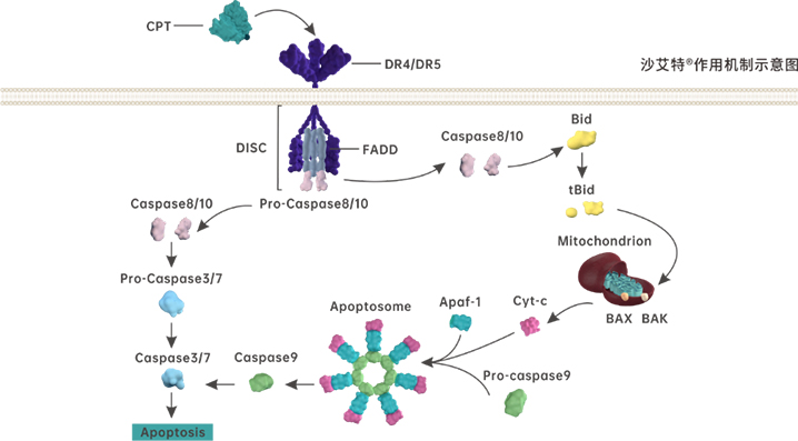 注射用埃普奈明為重組變構(gòu)人腫瘤壞死因子相關(guān)凋亡誘導(dǎo)配體(Circularly Permuted TRAIL,CPT),可結(jié)合并激活腫瘤細(xì)胞表面的死亡受體4(DR4)/死亡受體5(DR5),誘導(dǎo)不依賴p53的腫瘤細(xì)胞凋亡。